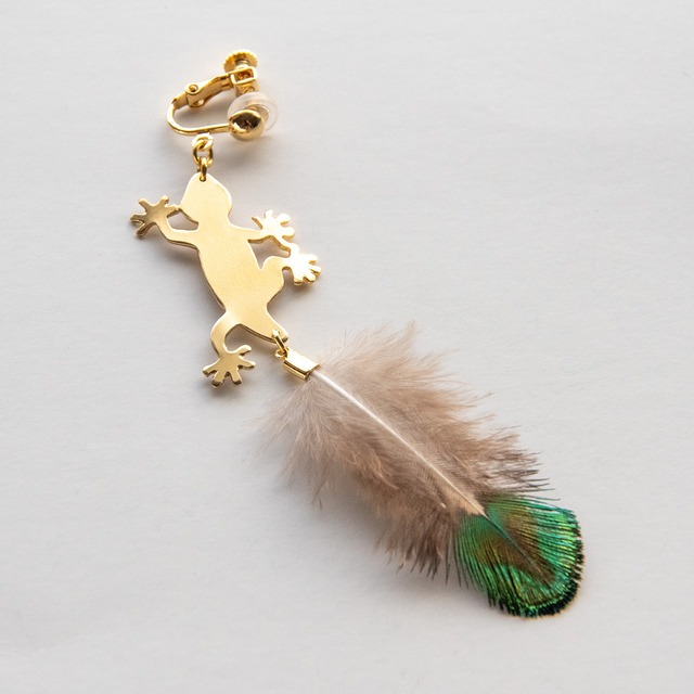 ヤモリが壁面を軽やかによじ登っている様子って とても愛らしいですよね。 ブローチやネックレスタイプよりも小さいヤモリのイヤリングです。 耳元で羽の尻尾をフリフリゆらして、一緒にお出かけしてくれます。 ヤモリがモチーフですがドラゴンの赤ちゃんをイメージしてデザインしました。 しっぽは個性が出るように、鳥の羽の色を生かしています。 真鍮部分はマット調に仕上げているため優しく輝きます。 この商品は写真と同じものをお届けいたします。 *************************** 本体素材: 真鍮 ⇒ 五円玉に使用されている優しい金色の金属です。 (経年変化を楽しんで頂くためにメッキ加工は施しておりません。錆止め剤を薄く塗っています。)その他、鳥の羽、留め具(メッキ加工) 全長 縦約 100mm × 横約 20mm ヤモリ部分 縦 35mm × 横 22mm 厚み0.8mm 羽部分 縦約 50mm × 横約 20mm 金具素材: ネジバネタイプのイヤリング。メッキ加工 (シリコンキャップを付けています。) ◎こちらの商品はオプション選択よりピアス金具に変更可能です。 ◎鳥の羽部分は柔らかい素材の為、優しく扱ってください。